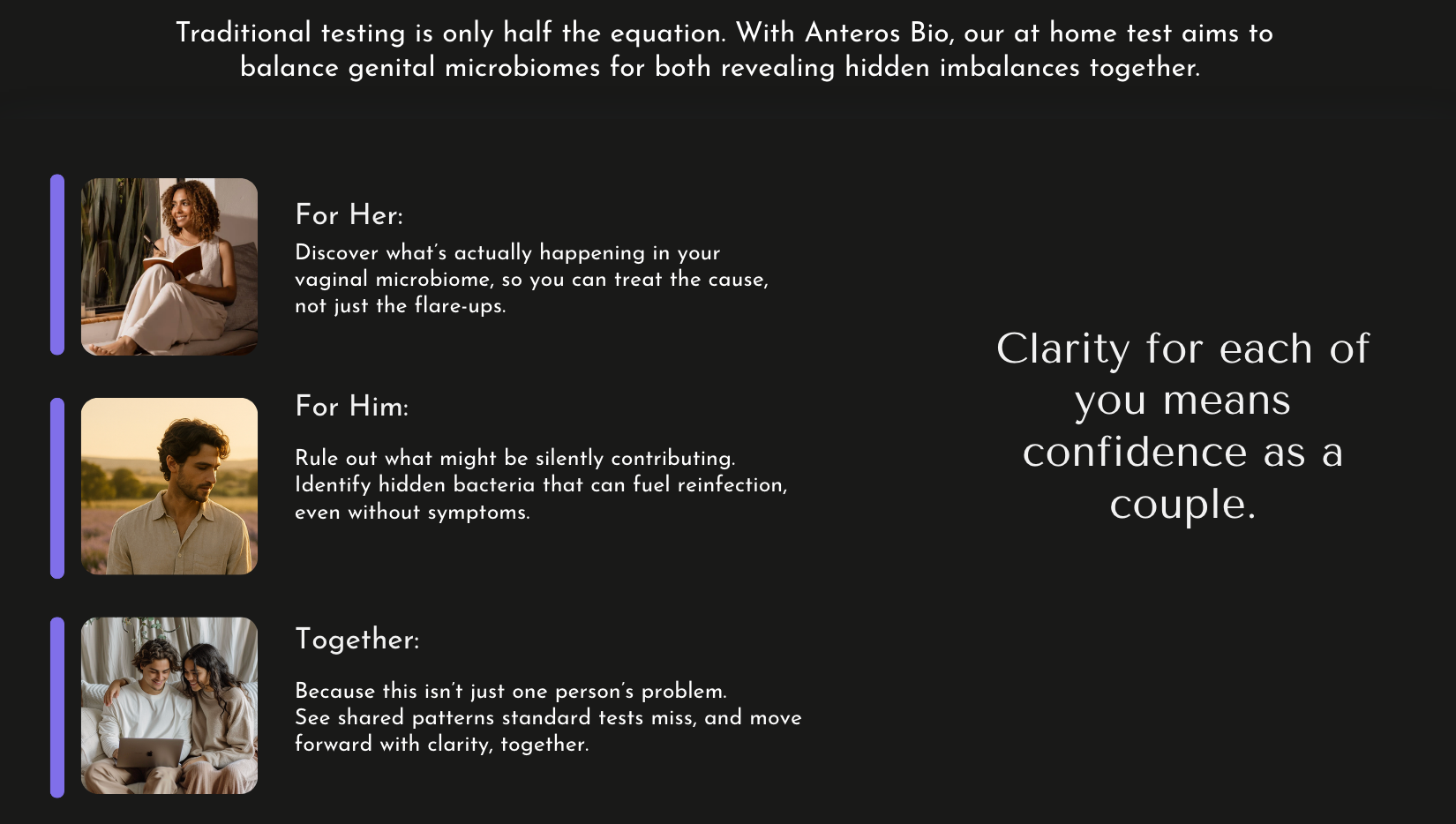We're committed to the couples who test with us, so we want to make sure we're the right fit for you and your partner at this stage in your sexual health journey. Just answer a few short questions about your situation and we'll let you know if we're a match.